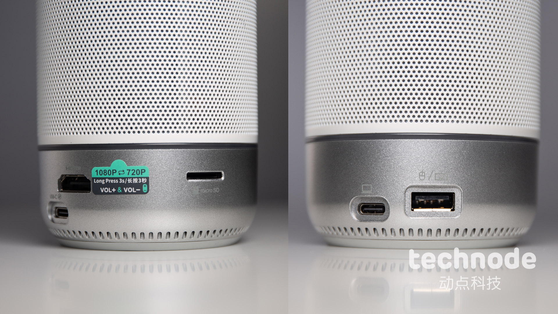 圆柱形机身顶部区域装备了:开要害、音量加减键、组合切换视图形式键、静音键。底部区域分别为:USB-A接口、USB-C接口(两个)、HDMI接口、以太网接口、Micro SD卡槽。底部接口的上端区域还装备了环状的提示灯带,经过红、蓝、绿三色来显现机器运行的状况。一起在机身底部装备了1/4螺栓口,便于调配脚架运用,在不同场景内取得更为灵敏的拍照视角。
