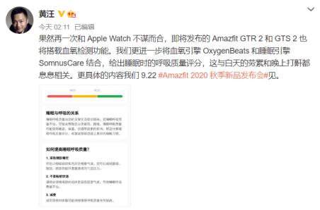 发布会完毕之后,华米科技 CEO 黄汪在微博上表明“再一次和 Apple Watch 不约而同”。黄汪表明,华米本月发布的新品 Amazfit GTR 2 和 GTS 2 也将搭载血氧检测功用。一起,手表还将进一步将血氧引擎 OxygenBeats 和睡觉引擎 SomnusCare 结合,给出睡觉时的呼吸质量评分。