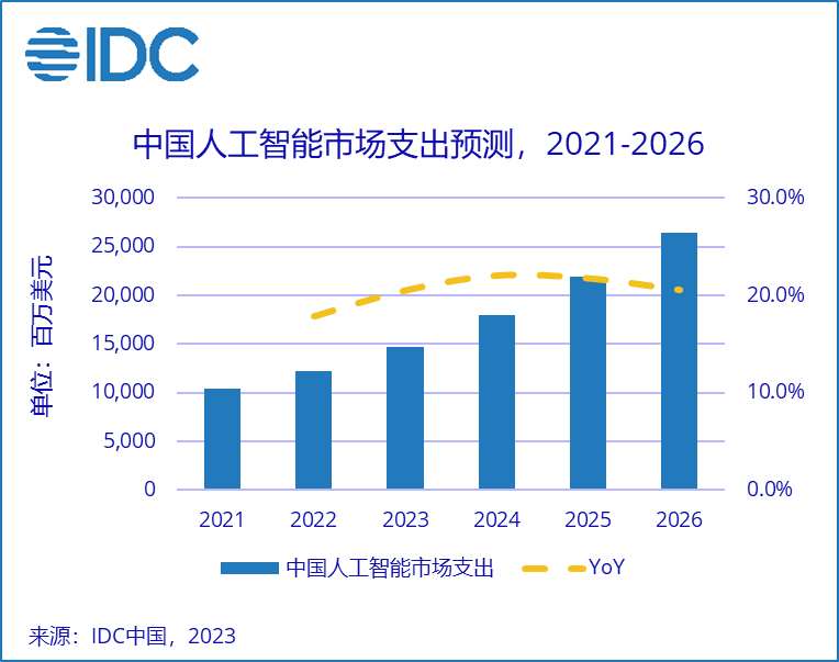 IDC于近来发布了《2023年V1全球人工智能开销攻略》(IDC Worldwide Artificial Intelligence Spending Guide)。最新猜测数据显现,我国人工智能(AI)商场开销规划将在2023年增至147.5亿美元,约占全球总规划十分之一。受疫情、地缘政治及宏观经济等要素的影响,IDC小幅下调了2022年我国AI商场规划,比较2021年增加约为17.9%。久远来看,AI技能的立异迭代驱动了运用场景的进一步落地,以AIGC、数字人、多模态、AI大模型、智能决议计划为代表的热门为商场带来了更多想象力和可能性。一起,企业对本身“数字化”、“数智化”转型的活跃推进催生出对AI技能的多元化需求,为我国AI商场规划的长时间增加奠定了根底。IDC估计,2026年我国AI商场将完成264.4亿美元商场规划,2021-2026五年复合增加率(CAGR)将超20%。